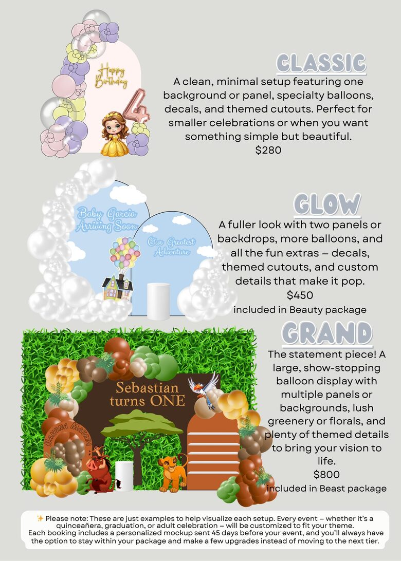 Every celebration deserves a setup that feels as special as the occasion itself. Our balloon menu is designed to help you choose the perfect look. From simple and timeless to bold and unforgettable. Each tier offers a unique level of detail, décor, and customization, making it easy to match your vision and event style.