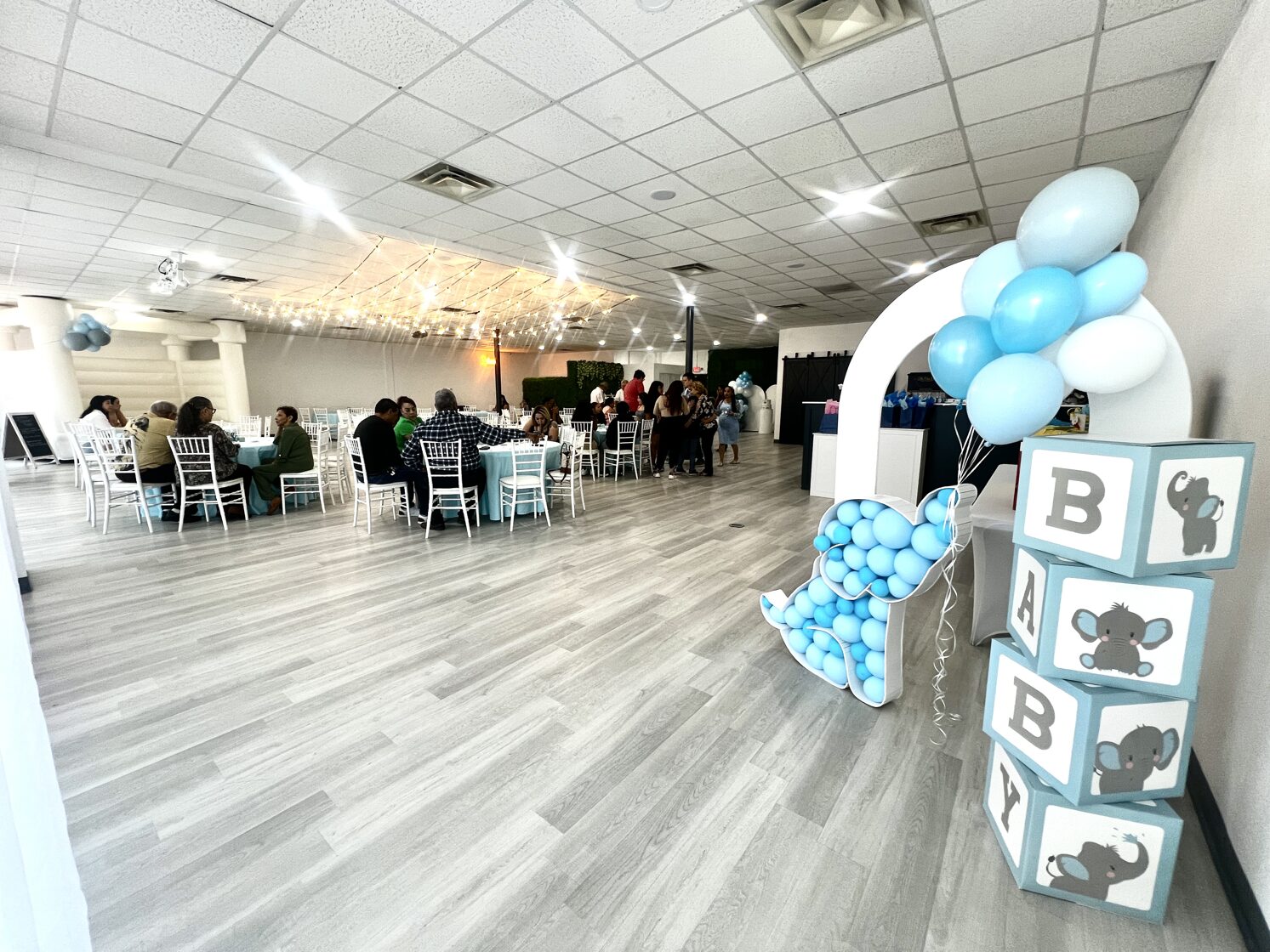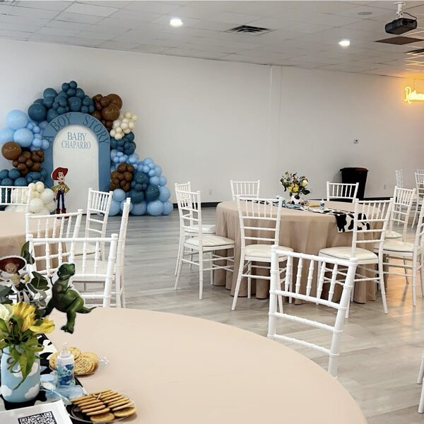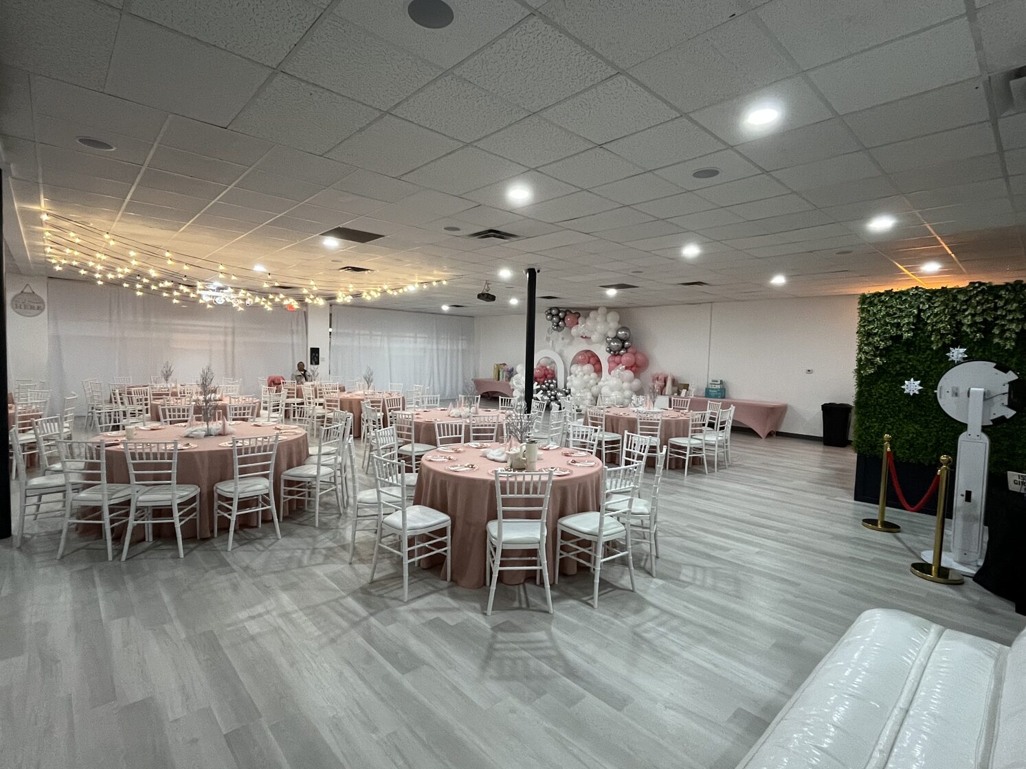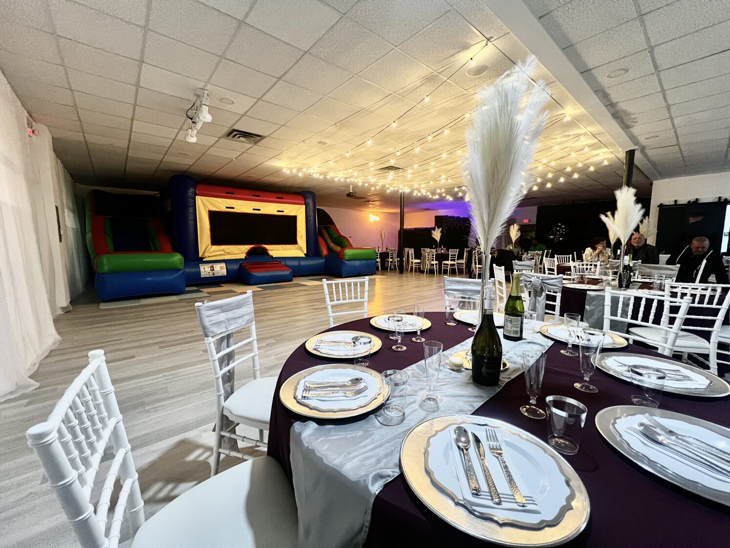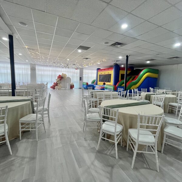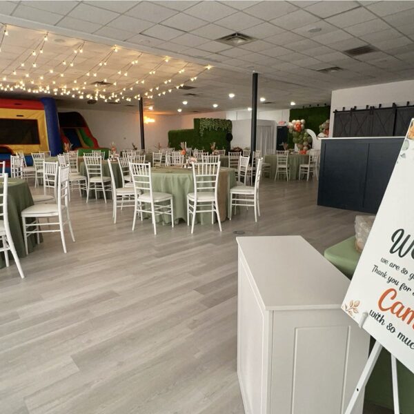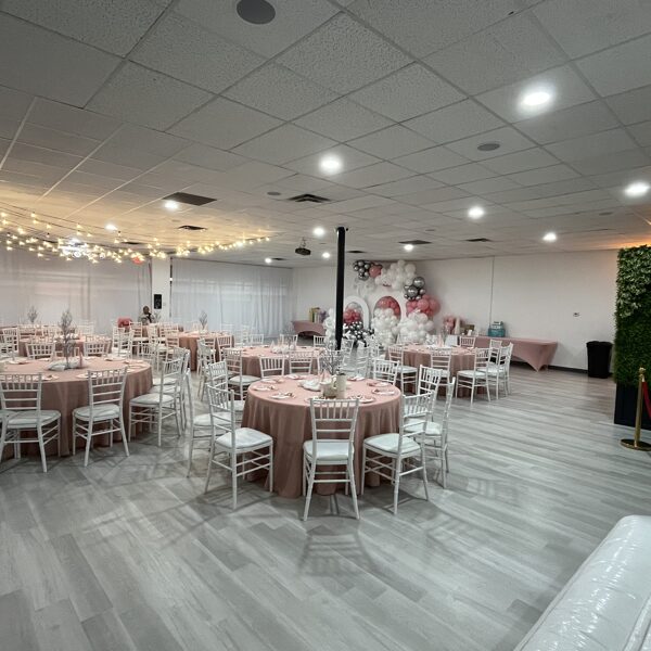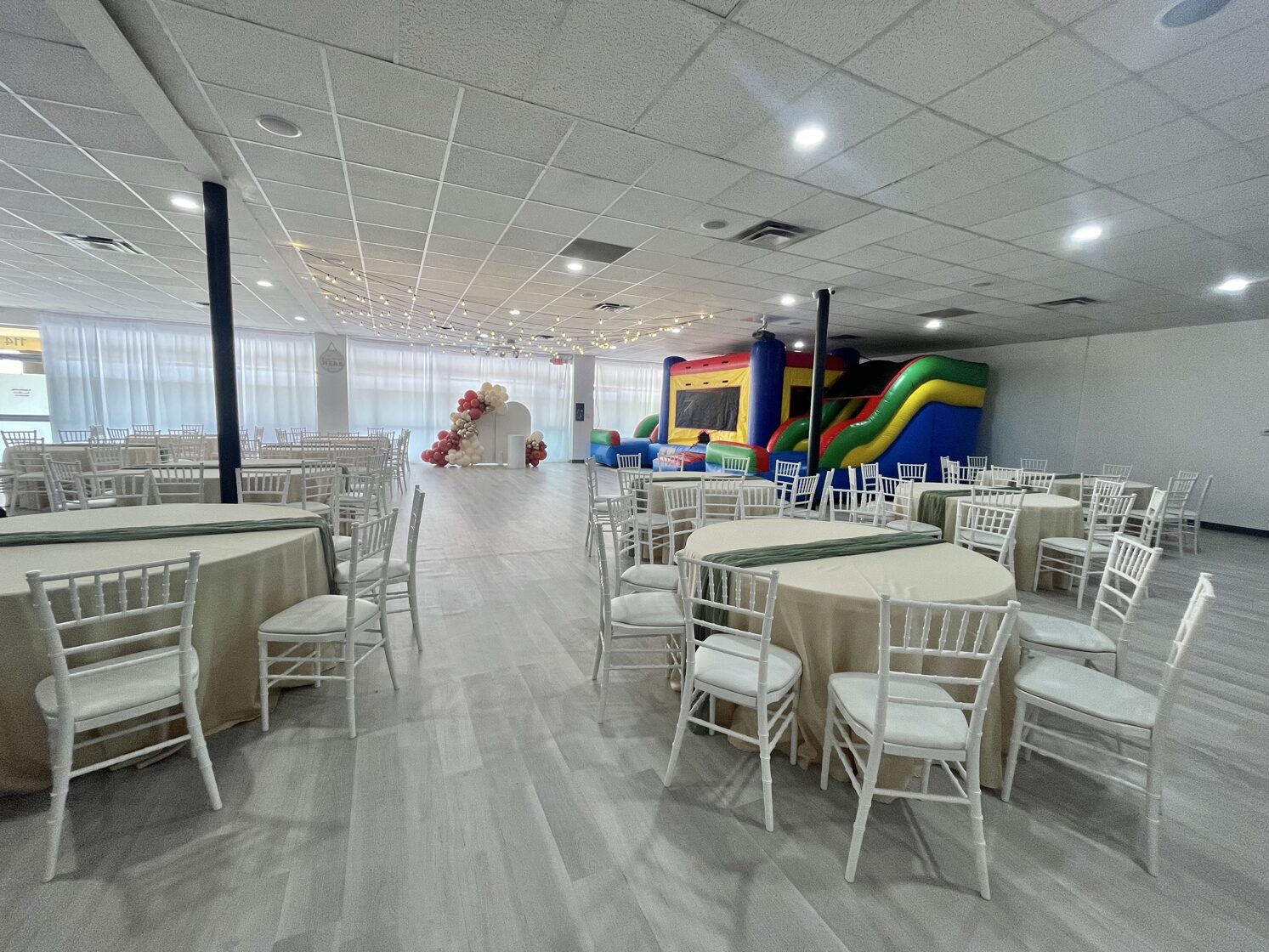 Every event is unique. Layouts adjust to your needs. Jumping balloons are optional with two design styles available, or they can be removed for events such as weddings or occasions that require a larger dance floor. 120 capacity.