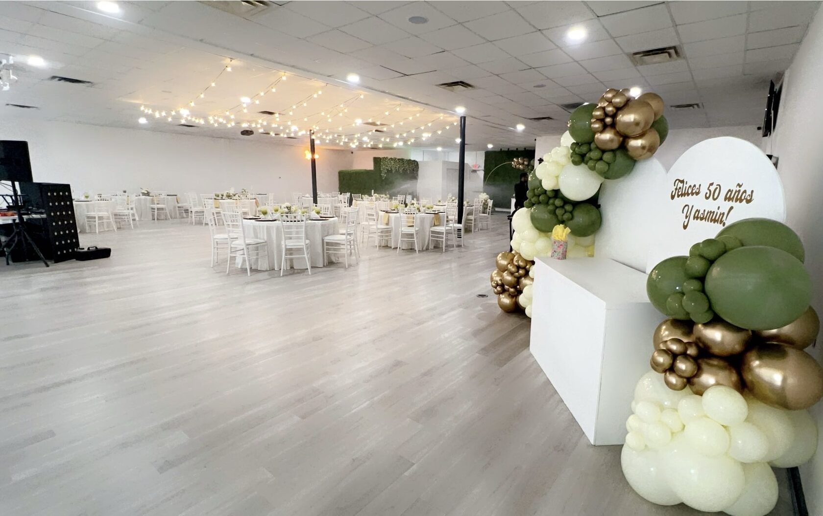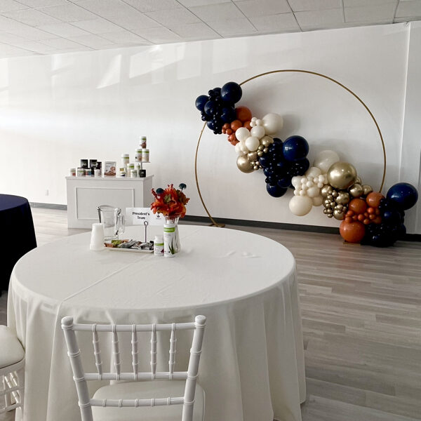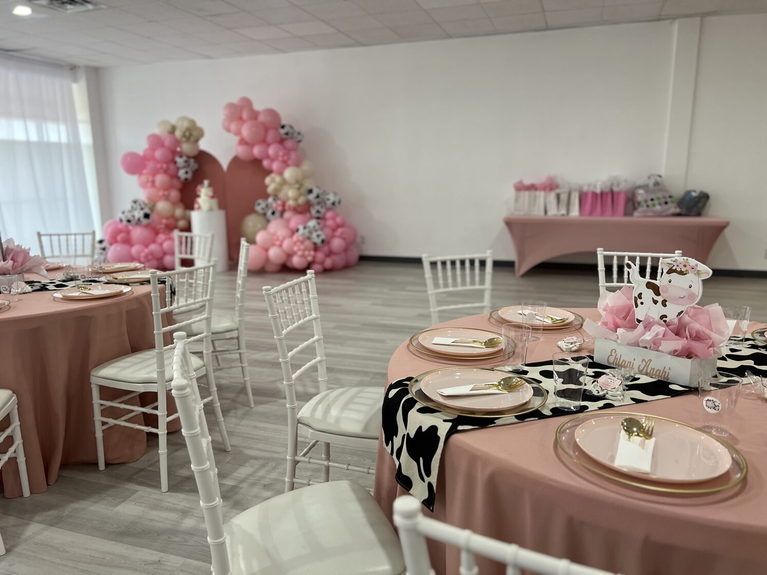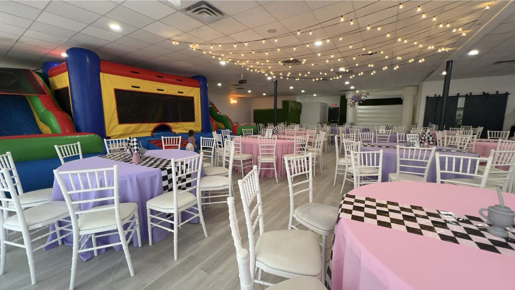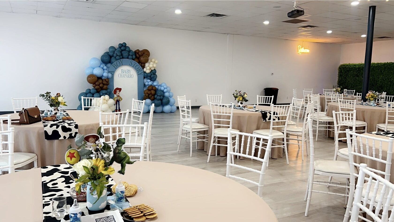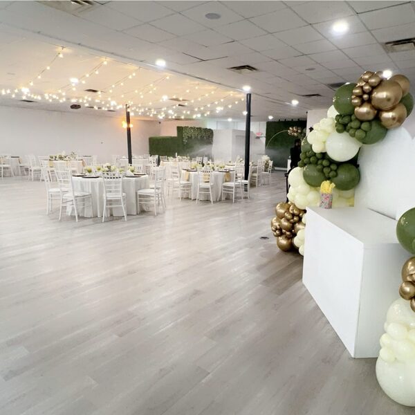 Every event is unique. Layouts adjust to your needs. Jumping balloons are optional with two design styles available, or they can be removed for events such as weddings or occasions that require a larger dance floor. 120 capacity.