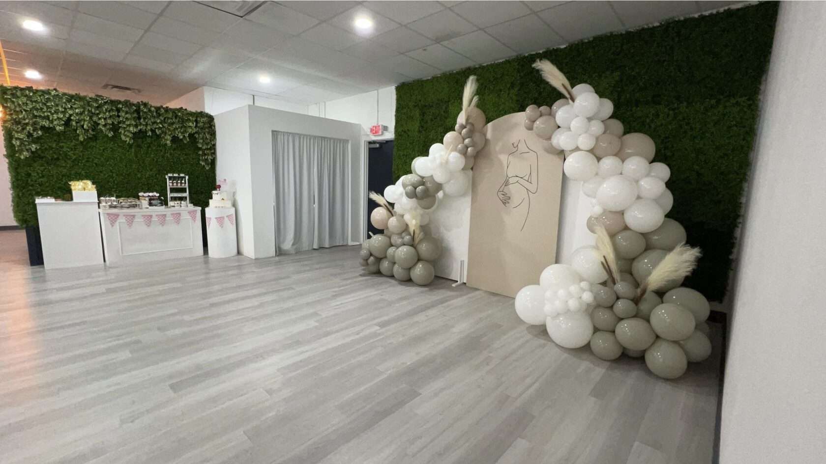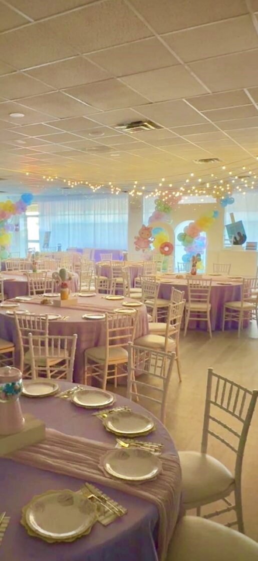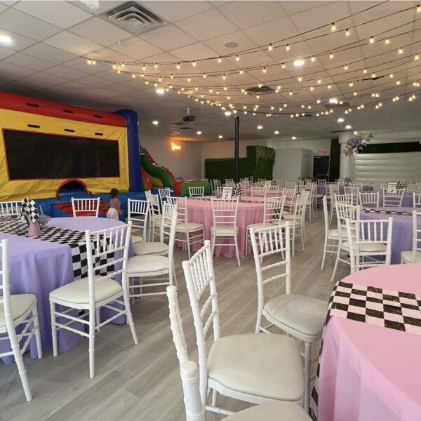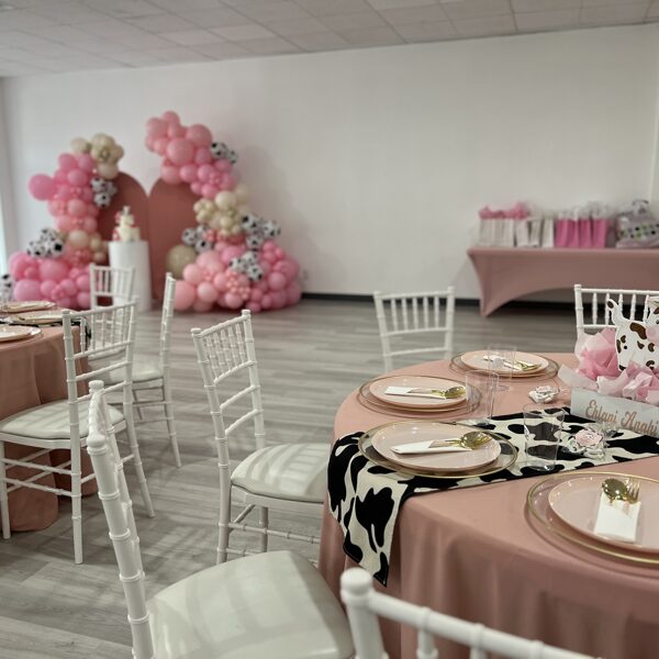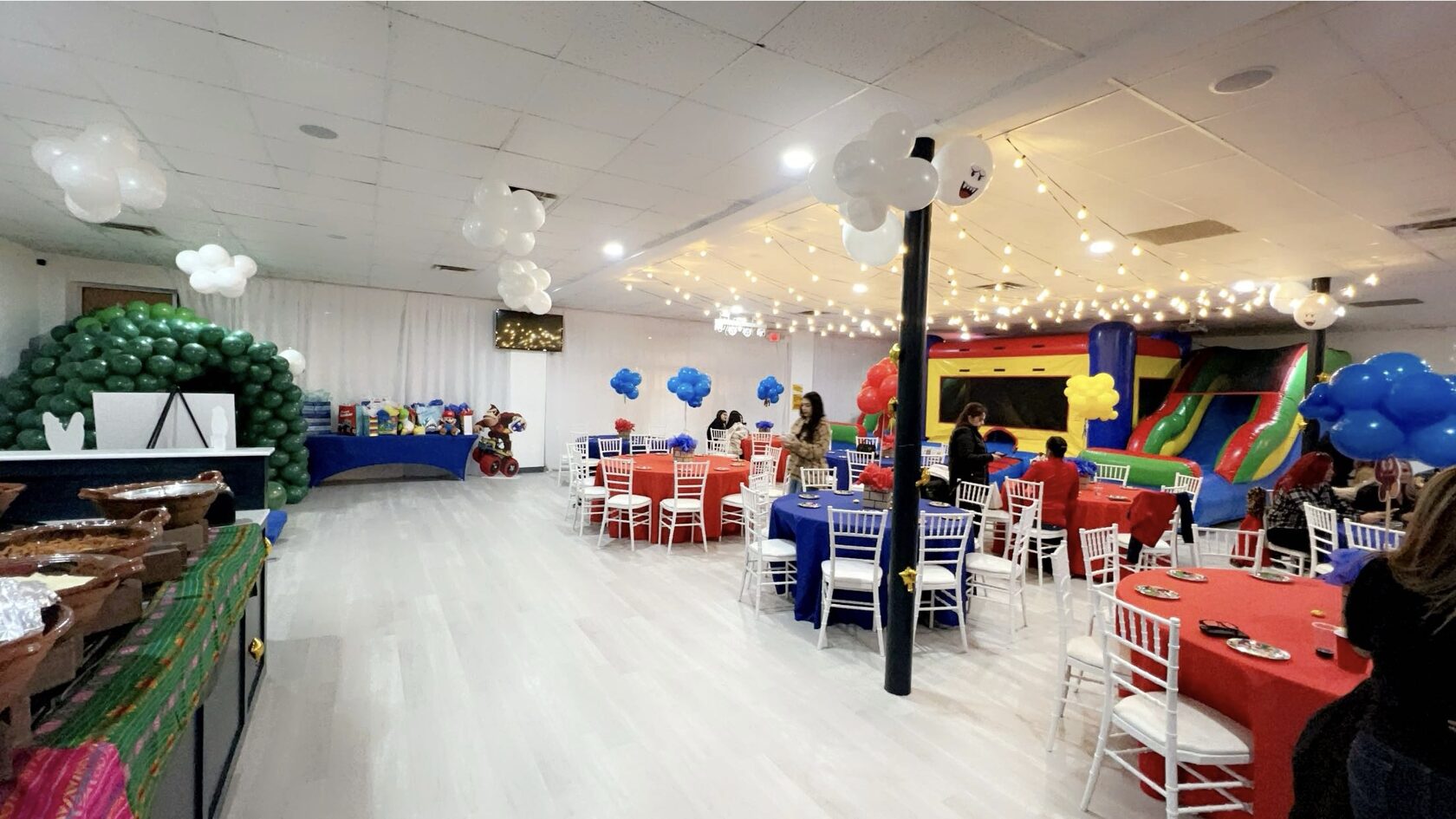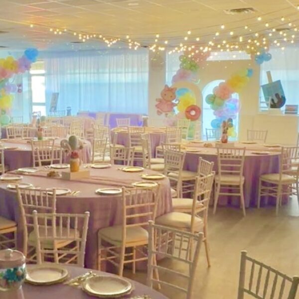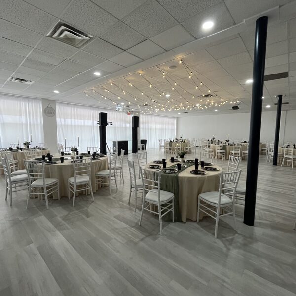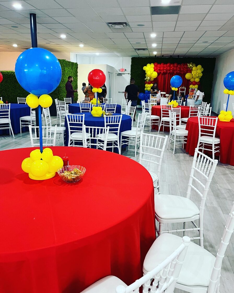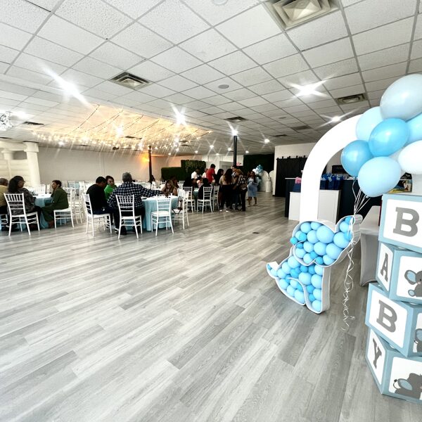 Every event is unique. Layouts adjust to your needs. Jumping balloons are optional with two design styles available, or they can be removed for events such as weddings or occasions that require a larger dance floor. 120 capacity.