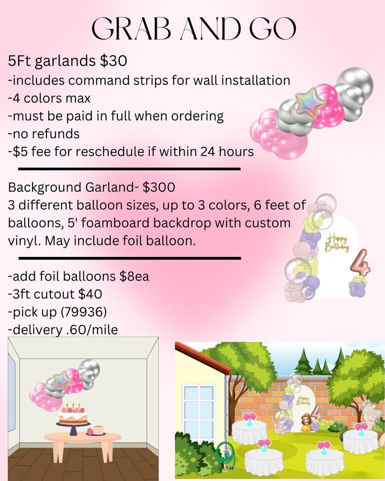 For a bigger statement, our Full Backdrop Grab-and-Go Garland includes the backdrop base and requires a large SUV or truck for pickup. If your vehicle isn’t big enough, delivery is available at $0.60 per mile from Be Our Guest Event Center. Delivery for these larger setups must be scheduled 1 week in advance based on availability.